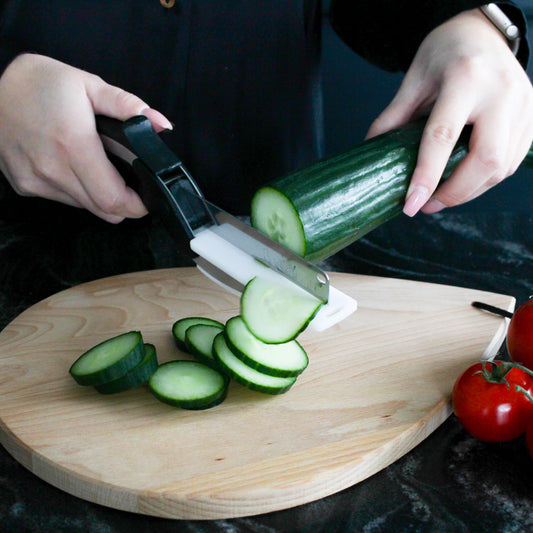 Das 2 in 1 Scherenmesser ist sehr praktisch und einfach zu bedienen. Es ist sehr scharf, so dass hartes Gemüse auch problemlos geschnitten werden kann. Außerdem kann man es in die Spülmaschine stellen.
